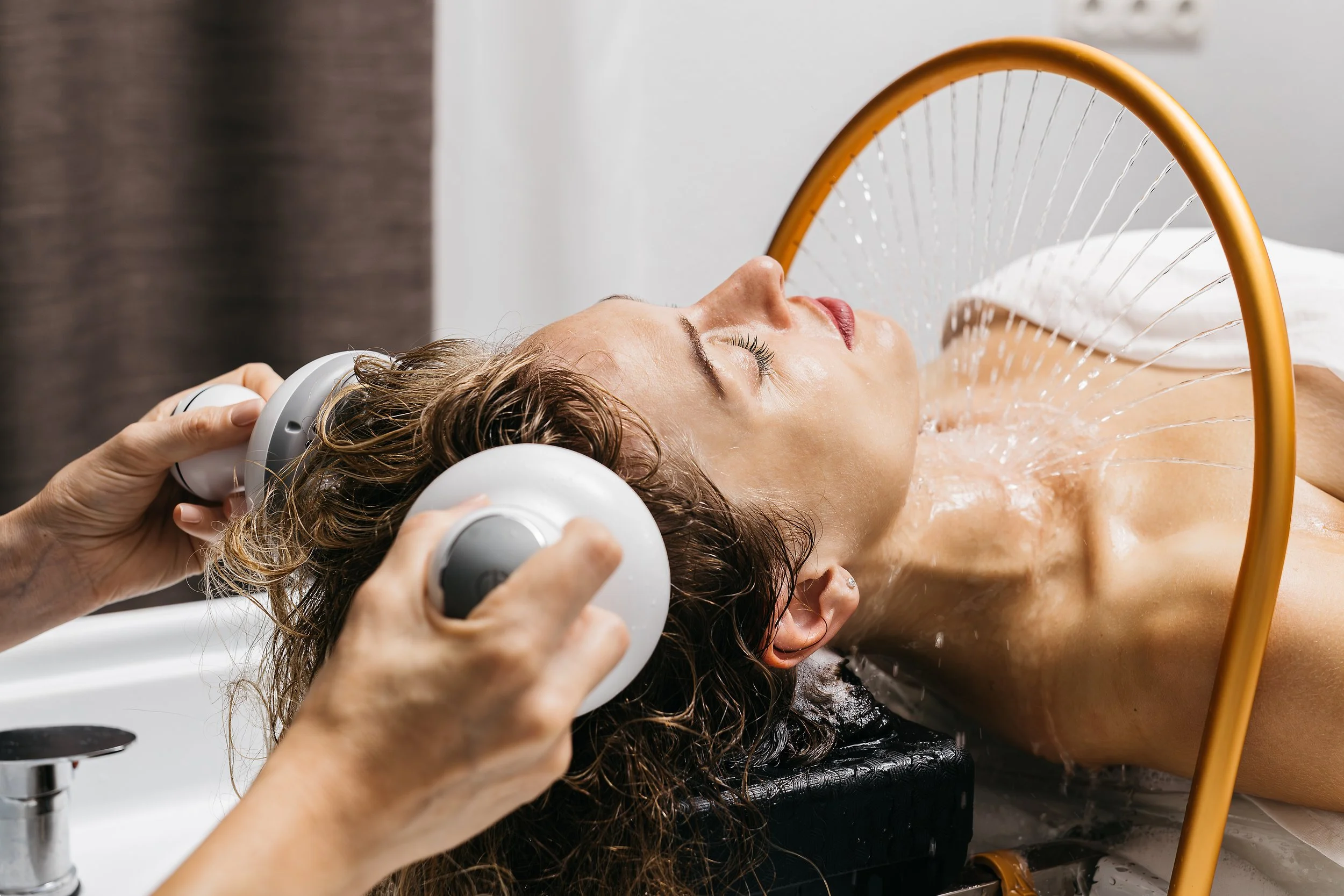 Deep scalp massage: Inspired by Japanese shiatsu and reflexology, targeted massage techniques increase circulation, release tension in the scalp, neck, and shoulders, and stimulate hair follicles.