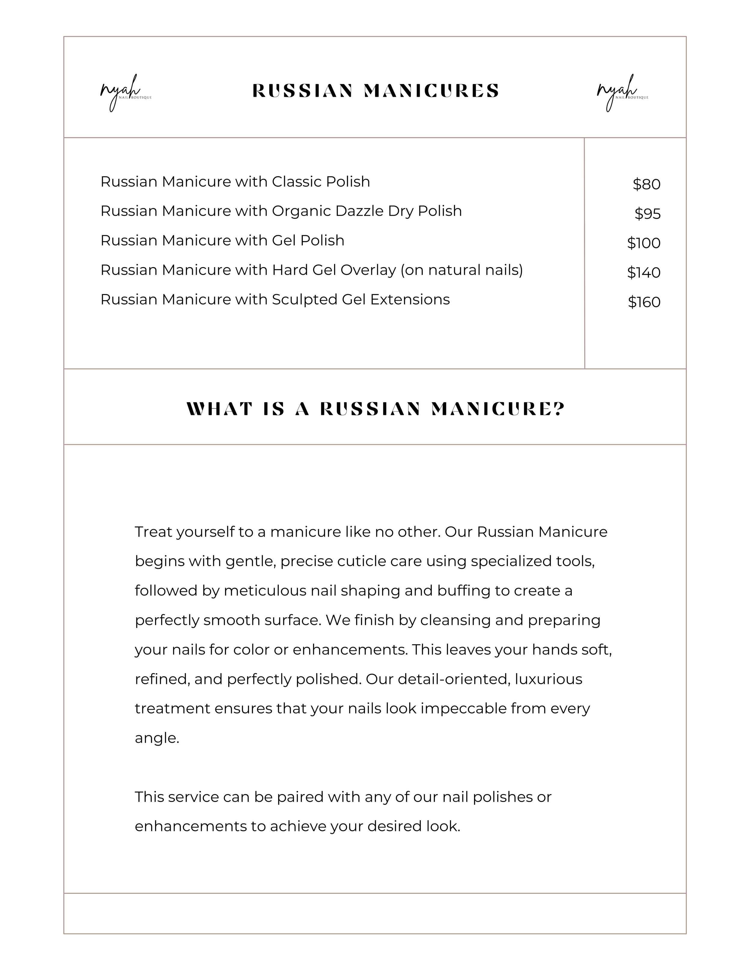 At NYAH Nail Boutique, we deliver luxury nail care with meticulous attention to hygiene, technique, and customer comfort.Every service uses premium, clean products and is performed by highly trained technicians in a serene, spa-like environment.